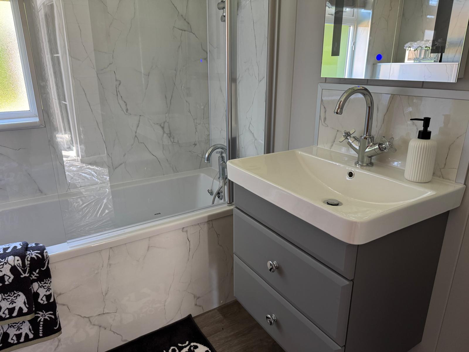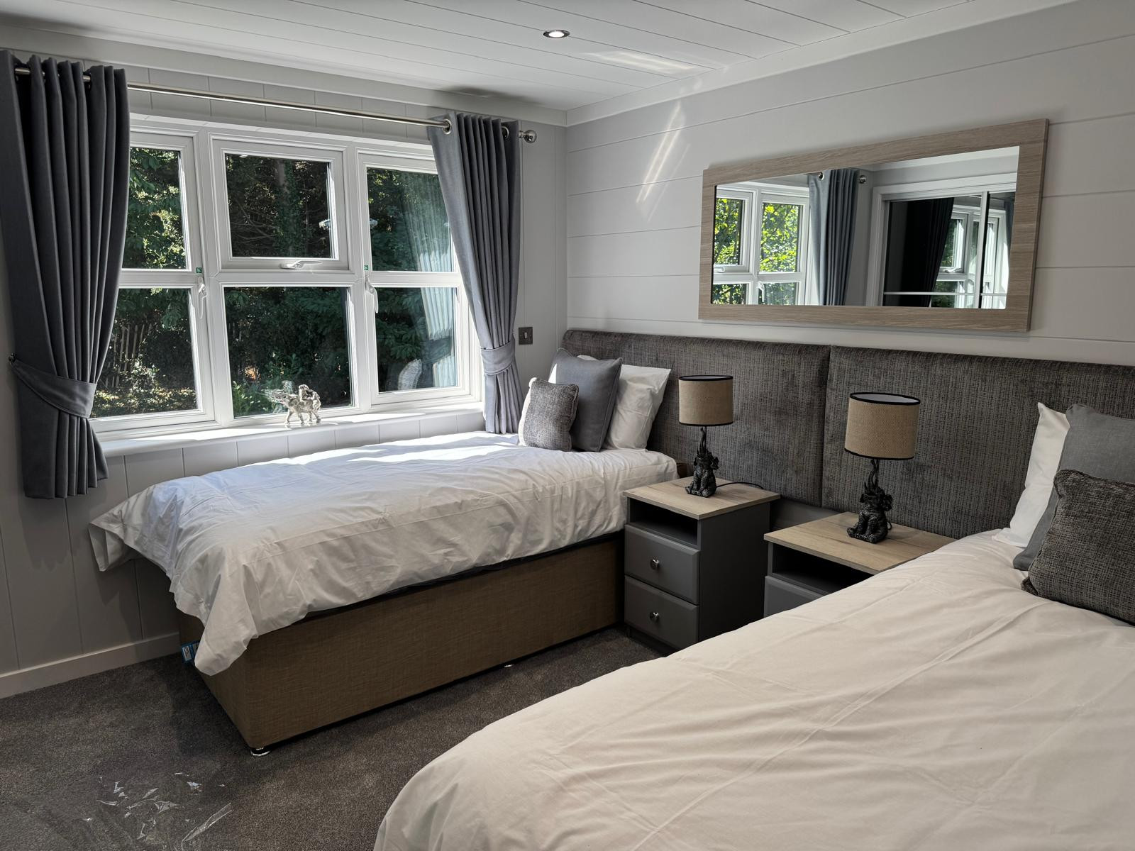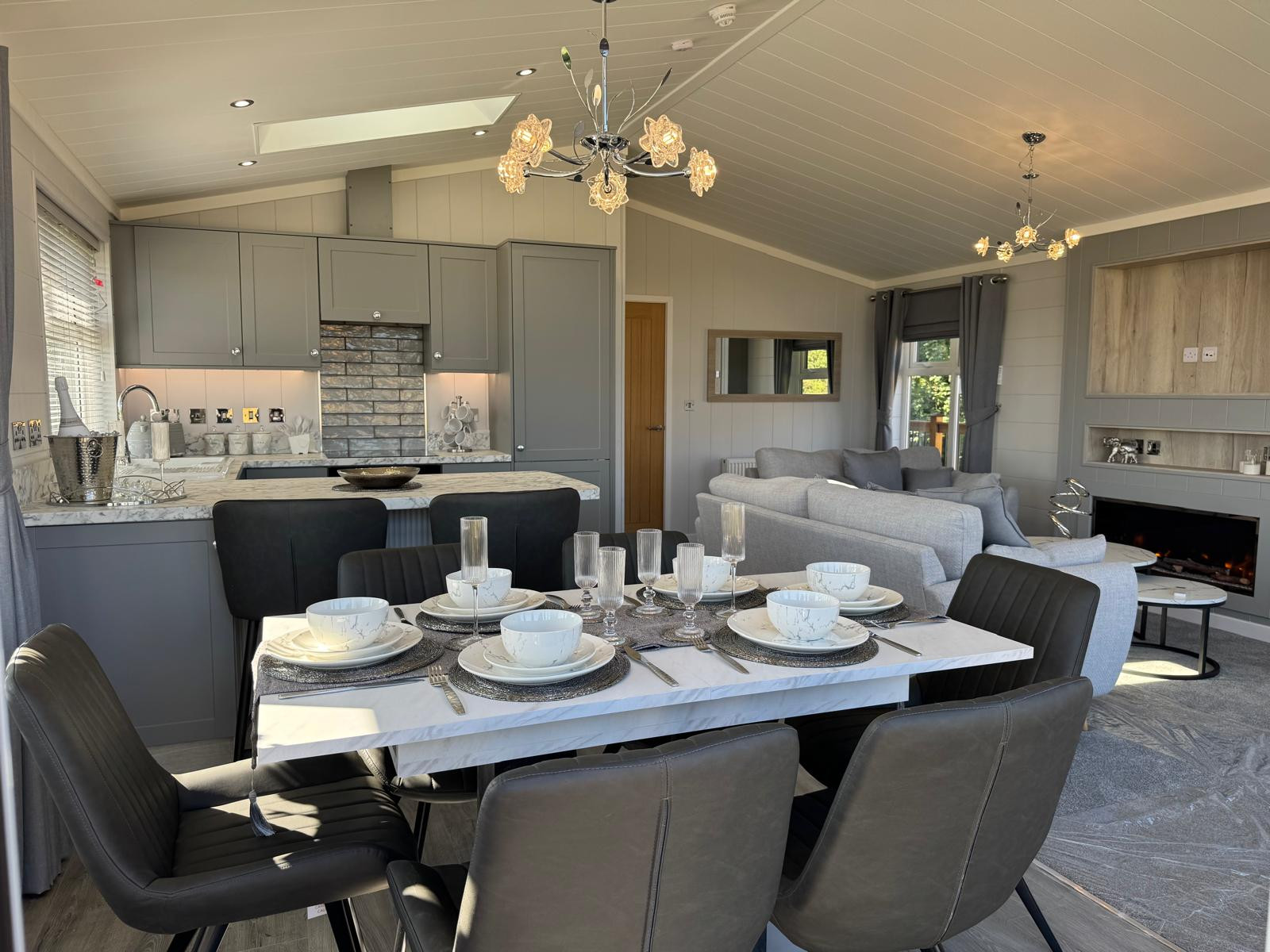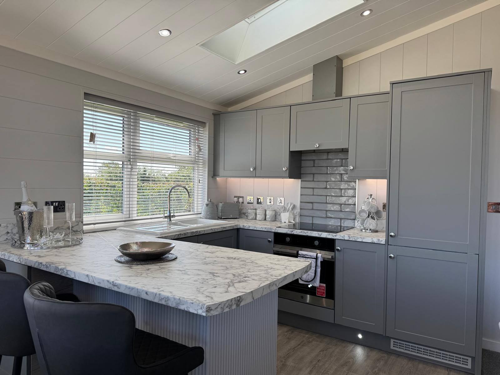 This brand new, modern furnished Omar Wessex Classic bespoke (45'x20') lodge is perfect for those looking for a detached, easy-to-maintain, leisure home. The luxury lodge has been designed with a Bespoke Modern Marble Lodge Theme and features large open plan modern kitchen/living/dining room with integrated appliances, separate utility room, three spacious bedrooms, 1 with en-suite and a separate bathroom.  Outside, the home backs onto woodland, with wrap around decking with glass balustrade at the front, and parking for 2 cars, it is also possible to add a hot tub.