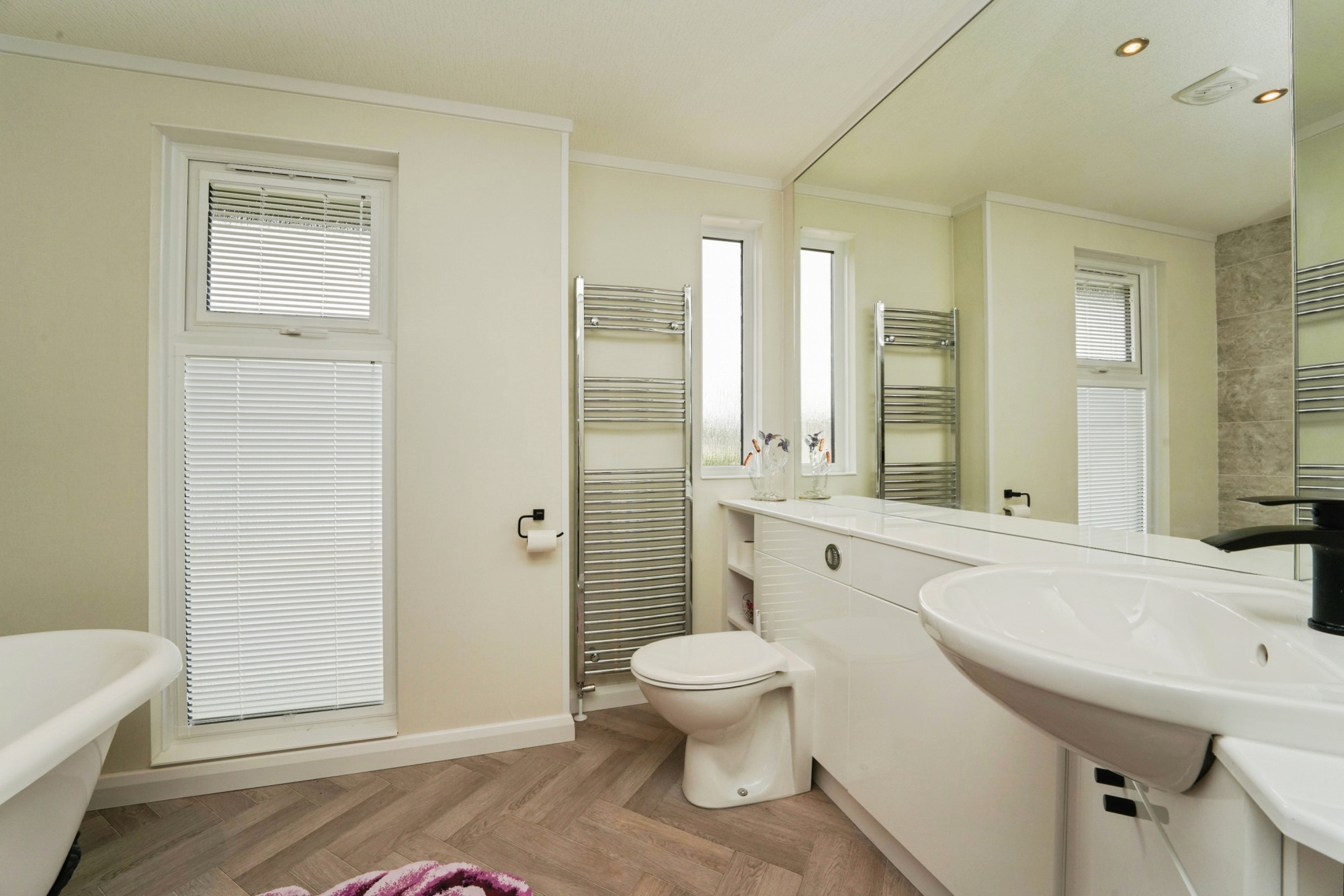 This pre-owned Stately Albion Hardwick (50'x22') park home is perfect for those looking for a detached, easy-to-maintain, bungalow-style property. The home has a spacious and modern kitchen and utility room with a garbage disposal, dining area and a comfortable living room with vaulted ceiling and patio doors leading out to the decking. The home has a study, ample storage, the master bedroom has an en suite and walk in wardrobe and the second double bedroom has a built-in wardrobe. The family bathroom has a free-standing bath. There is also a garage, driveway and garden space with countryside views.