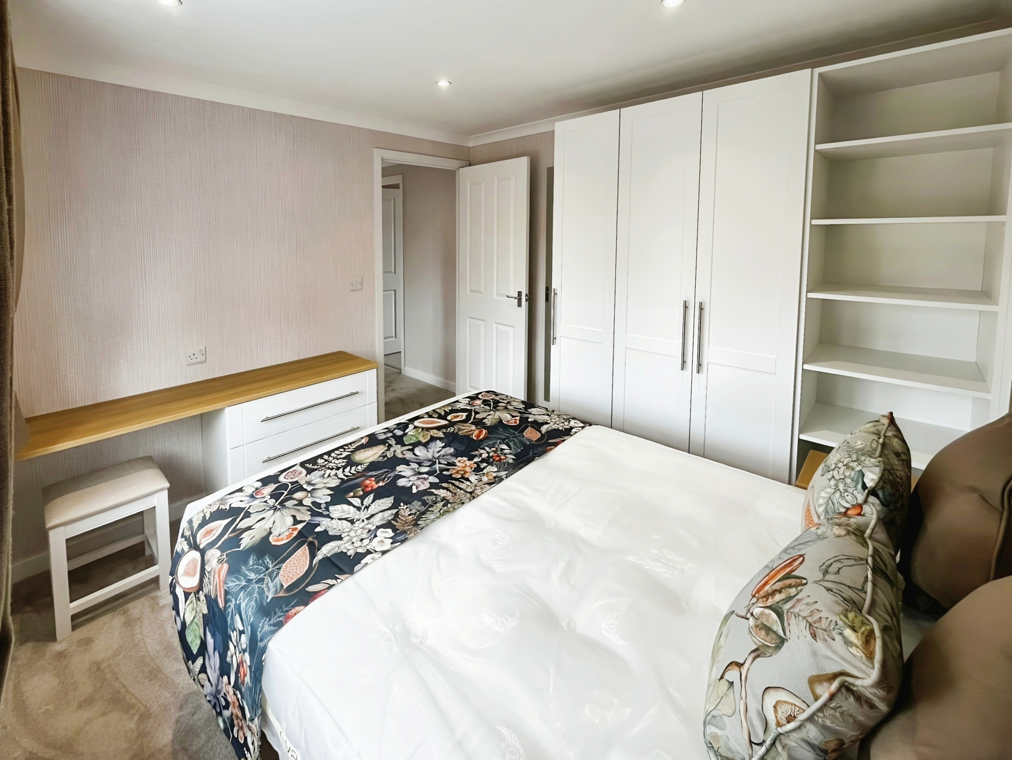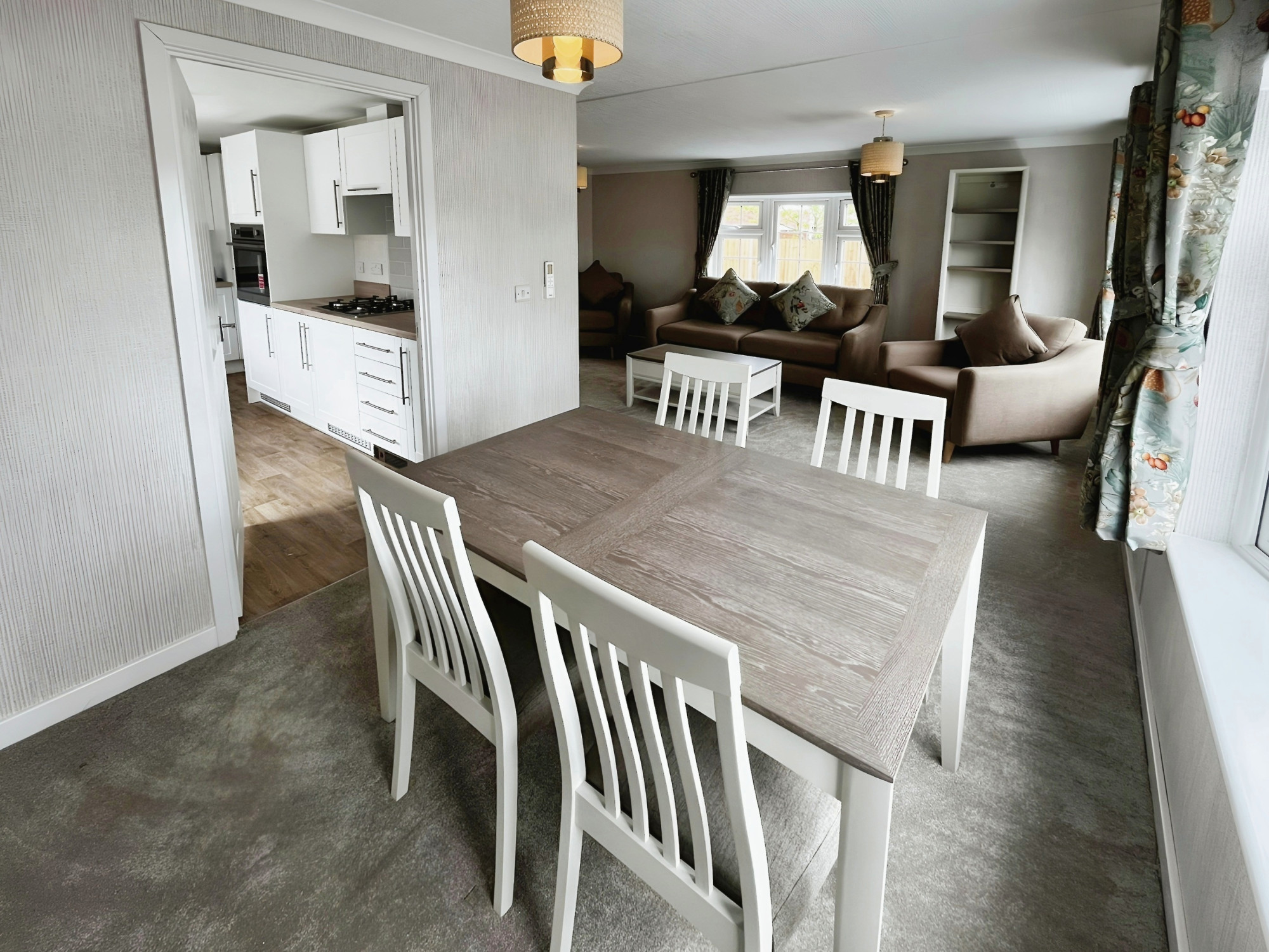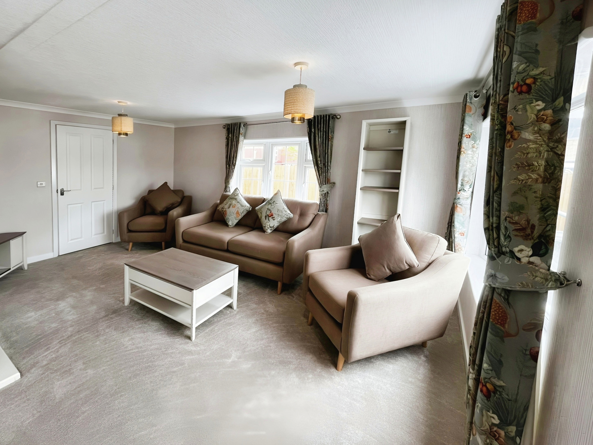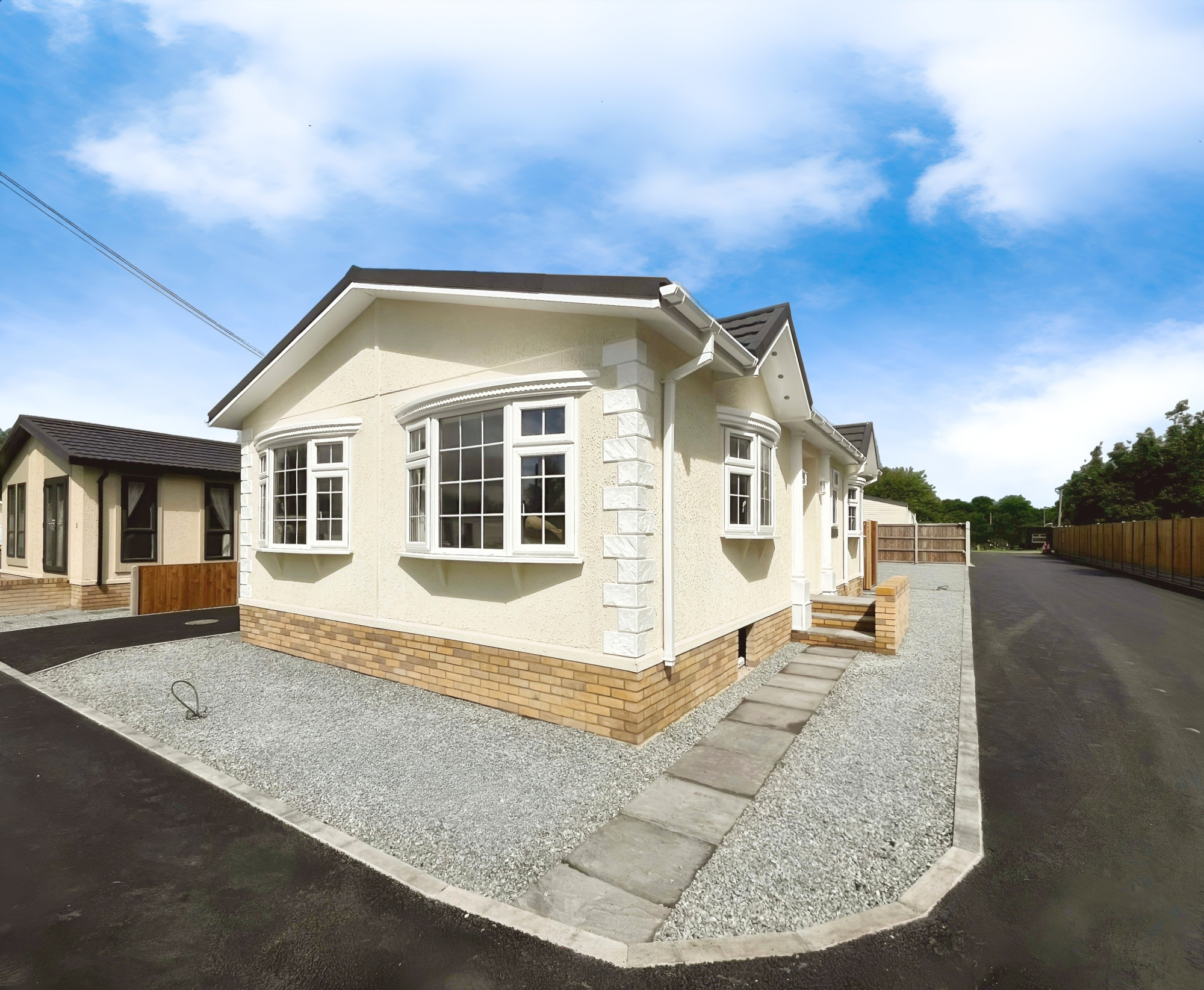 This brand-new, modern-furnished Omar Middleton (40'x20') luxury park home is perfect for those looking for a detached, easy-to-maintain, bungalow-style property. The home has a modern kitchen with integrated appliances, comfortable living room with an electric fireplace, two double bedrooms, an en suite and a bathroom. The landscaped exterior boasts an easy to maintain garden and driveway.