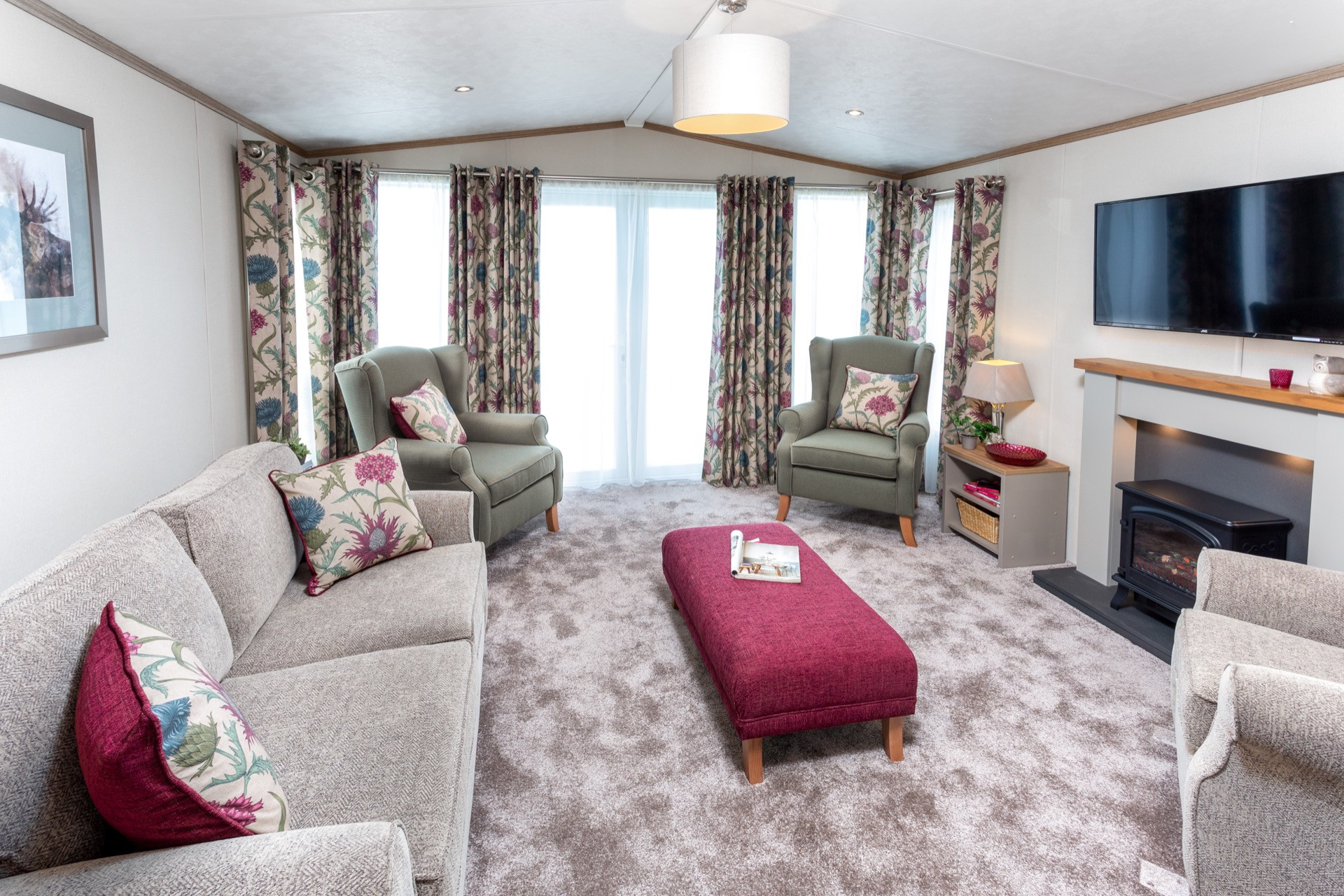 This brand new, modern-furnished Pemberton Abingdon (38'x14') luxury lodge is perfect for those looking for a detached, easy to maintain, bungalow-style property. The lodge has a kitchen with integrated appliances, and a comfortable living room with French doors and an electric fireplace. There are two bathrooms, an en suite and a family bathroom.