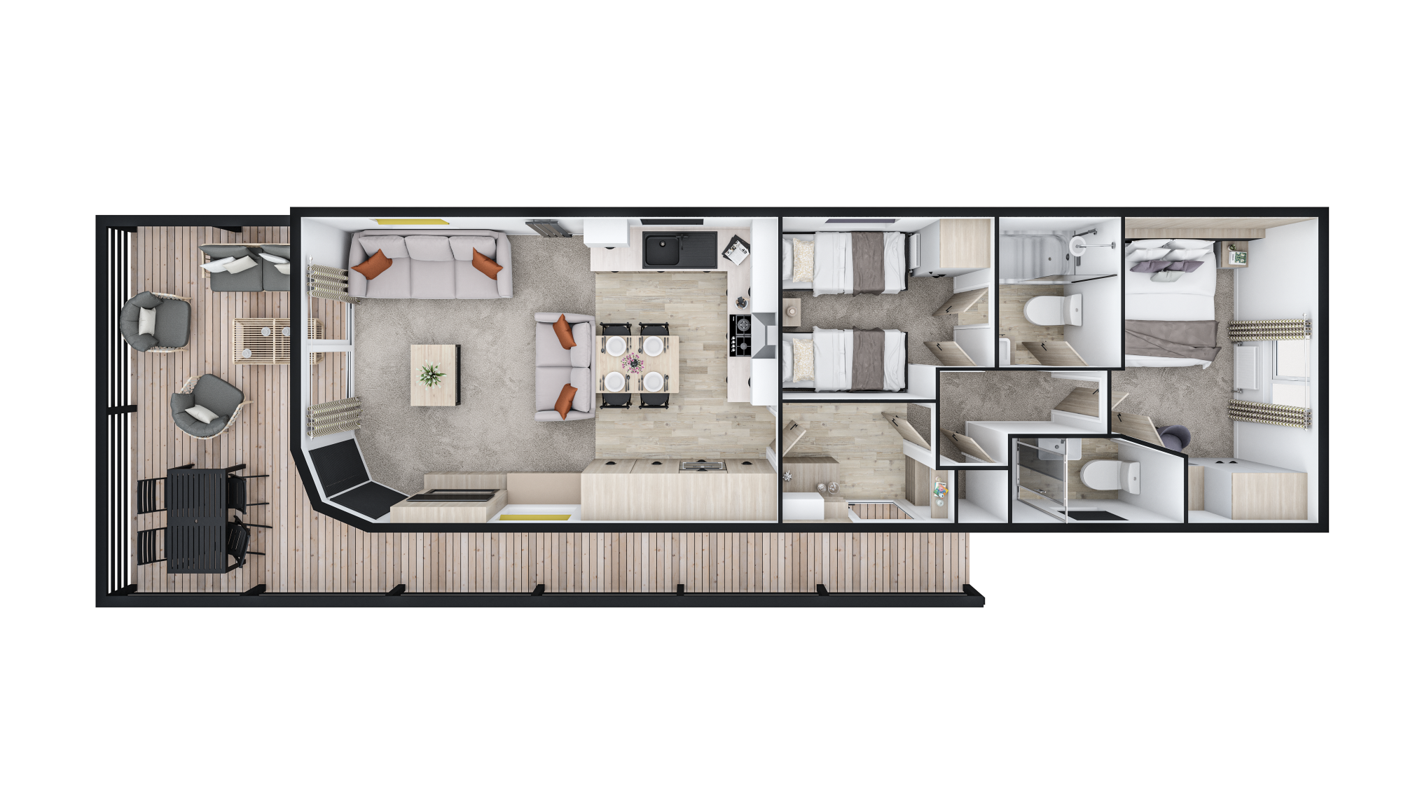 This brand new, modern-furnished Atlas Sherwood (41'x13') luxury park home is perfect for those looking for a detached, easy to maintain, bungalow-style property. The home has an open plan kitchen, living and dining area, with doors leading onto the decking. There are also two bedrooms and two bathrooms.