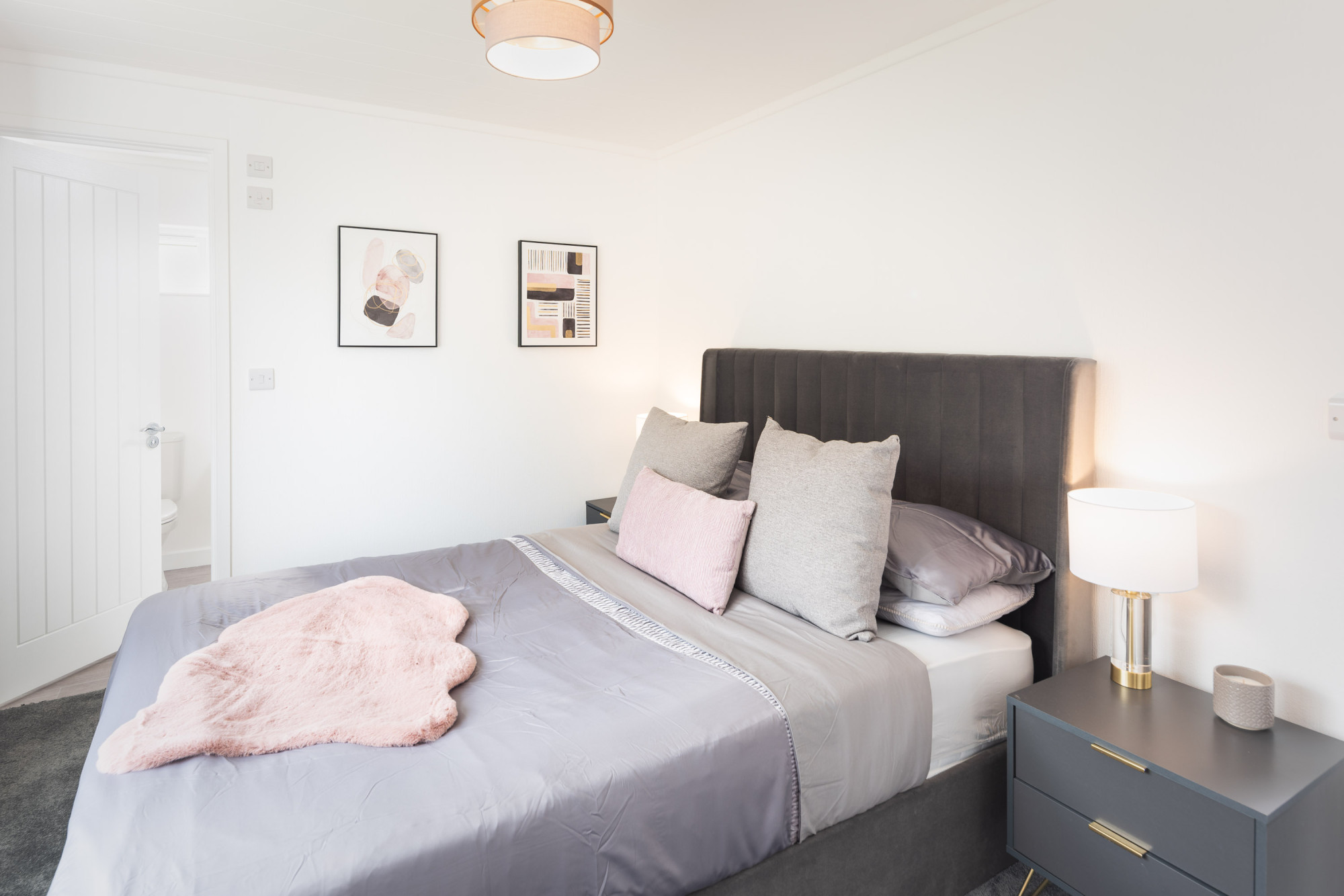 The primary suite offers a generous walk-in wardrobe & stylish en-suite, with a king-sized bed. The second bedroom & family bathroom are perfect for hosting friends & family. A separate study is the perfect place to work from home or can be used as a quiet retreat from the rest of your home. Outside are two private parking spaces and a private garden with raised patio.