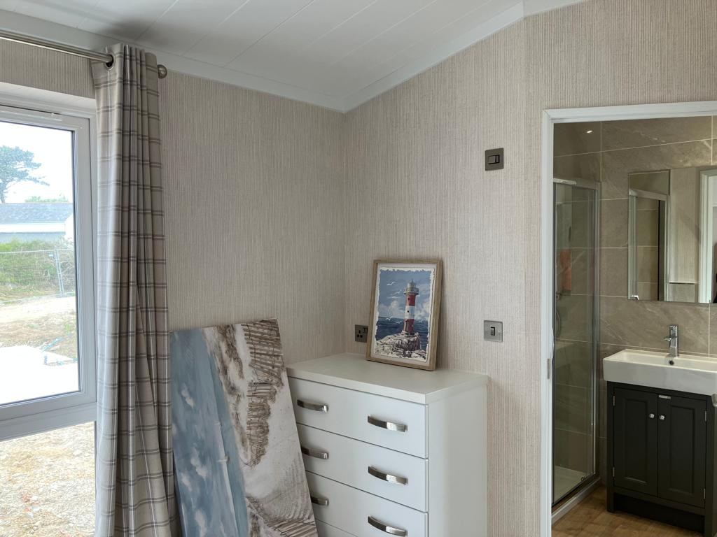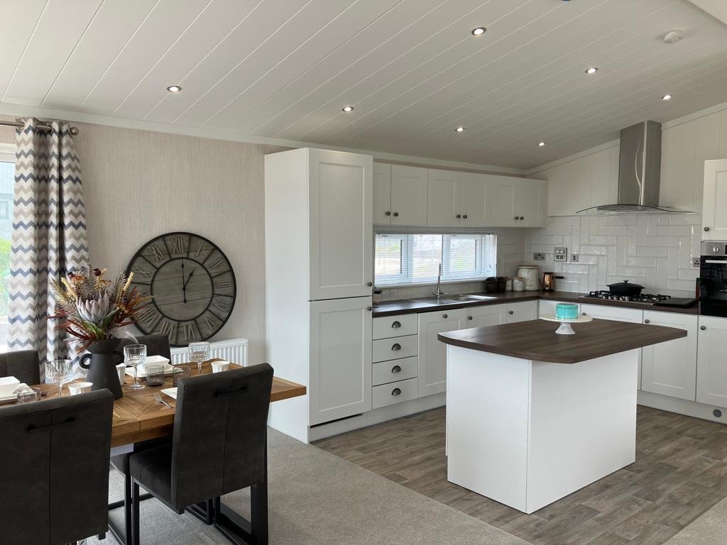 This brand new, modern-furnished Omar Alderney (45'x20') luxury park home is perfect for those looking for a detached, easy to maintain, bungalow-style property. The home features and open plan living space with a spacious kitchen with integrated appliances, an island and a dining area. The living area features an electric fireplace and large windows and French doors leading to the patio. The master bedroom has an en suite and and there is a second double bedroom and a bathroom.