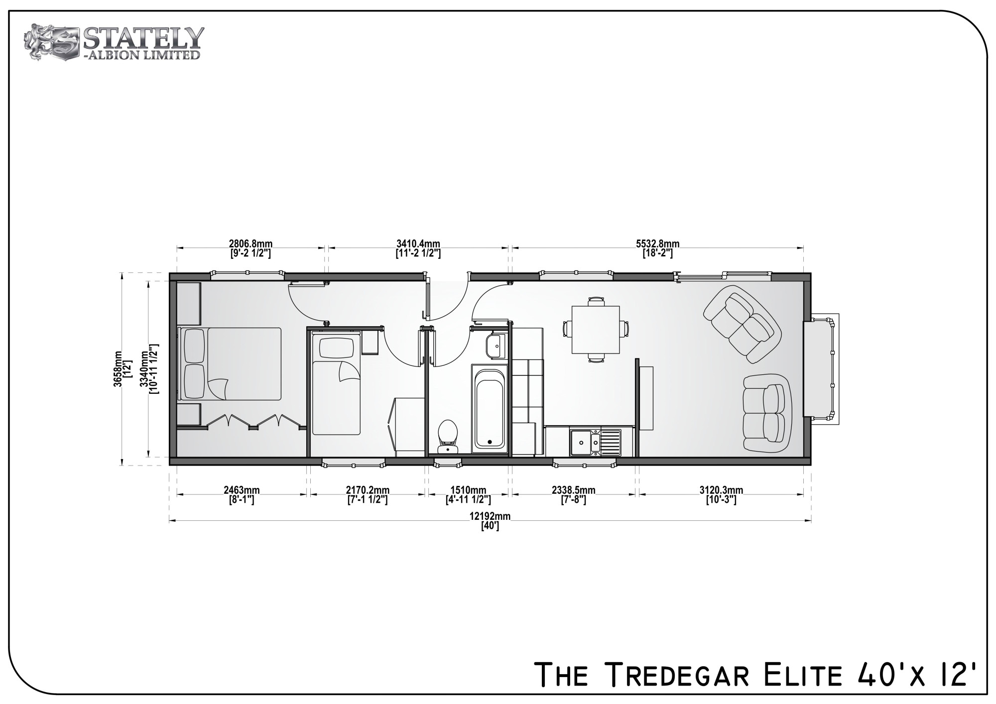 This brand-new, modern-furnished Stately Tredegar Elite (42'x12') luxury park home is perfect for those looking for a detached, easy-to-maintain, bungalow-style property. The home has a kitchen with integrated appliances, dining area, and a comfortable living room with an electric fireplace. There are two bedrooms and a bathroom. The home also has a driveway.