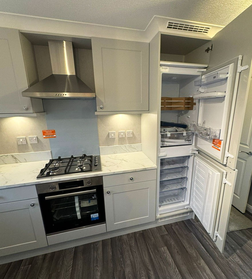 This brand-new, modern-furnished Stately Tredegar Elite (42'x14') luxury park home is perfect for those looking for a detached, easy-to-maintain, bungalow-style property. The home has a fully fitted kitchen with integrated appliances and a comfortable living room with an electric fireplace. There are two double bedrooms with storage and wardrobes, and a spacious bathroom with a walk in shower. There is also double glazing, central heating, and a driveway with off-road parking for 2 cars.