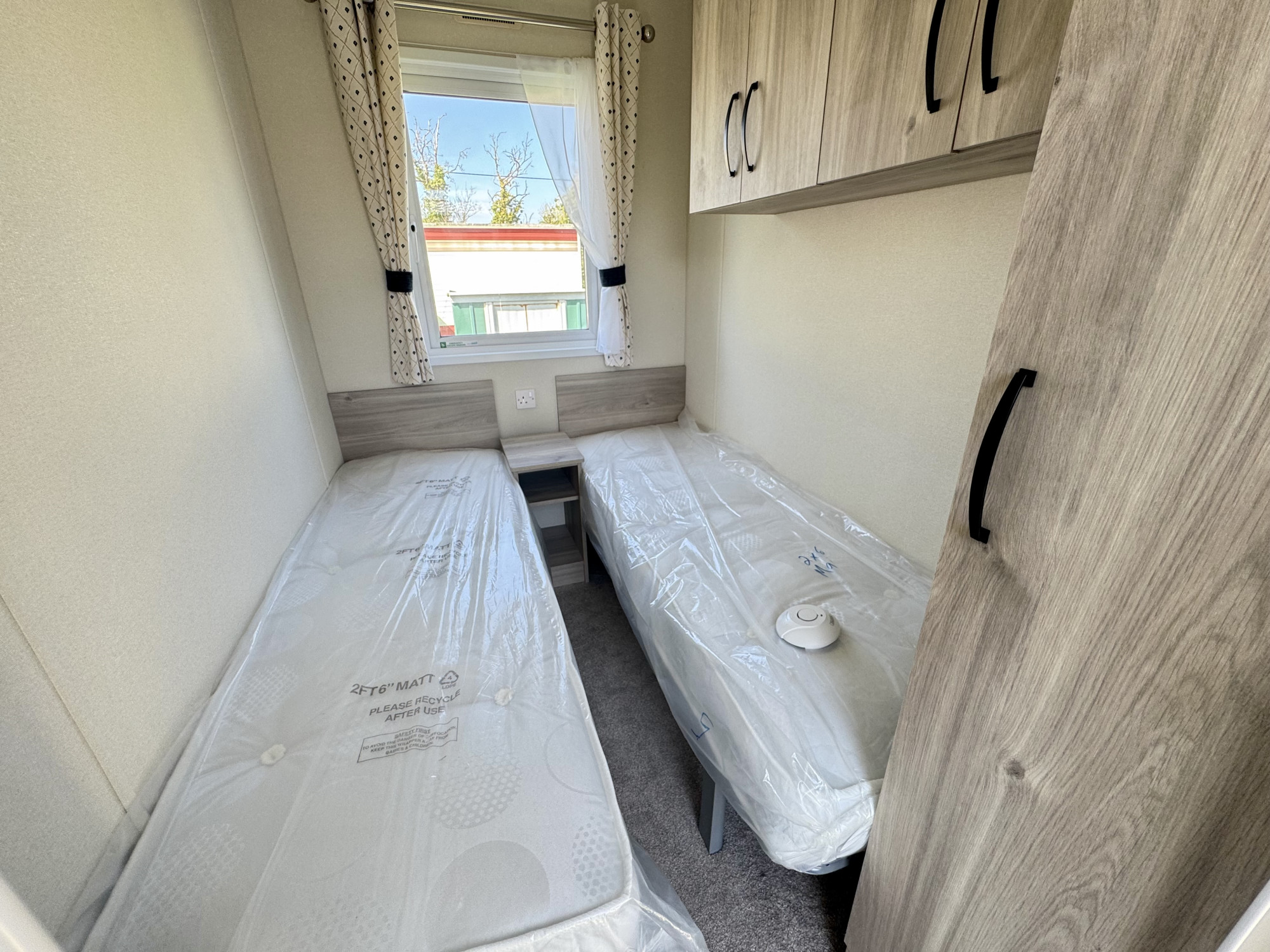 This brand new, modern, furnished Avalon lodge (28'x10') has an open plan kitchen, dining and living room area with integrated appliances. There is a double bedrooms, a second twin bedroom and a shower room.