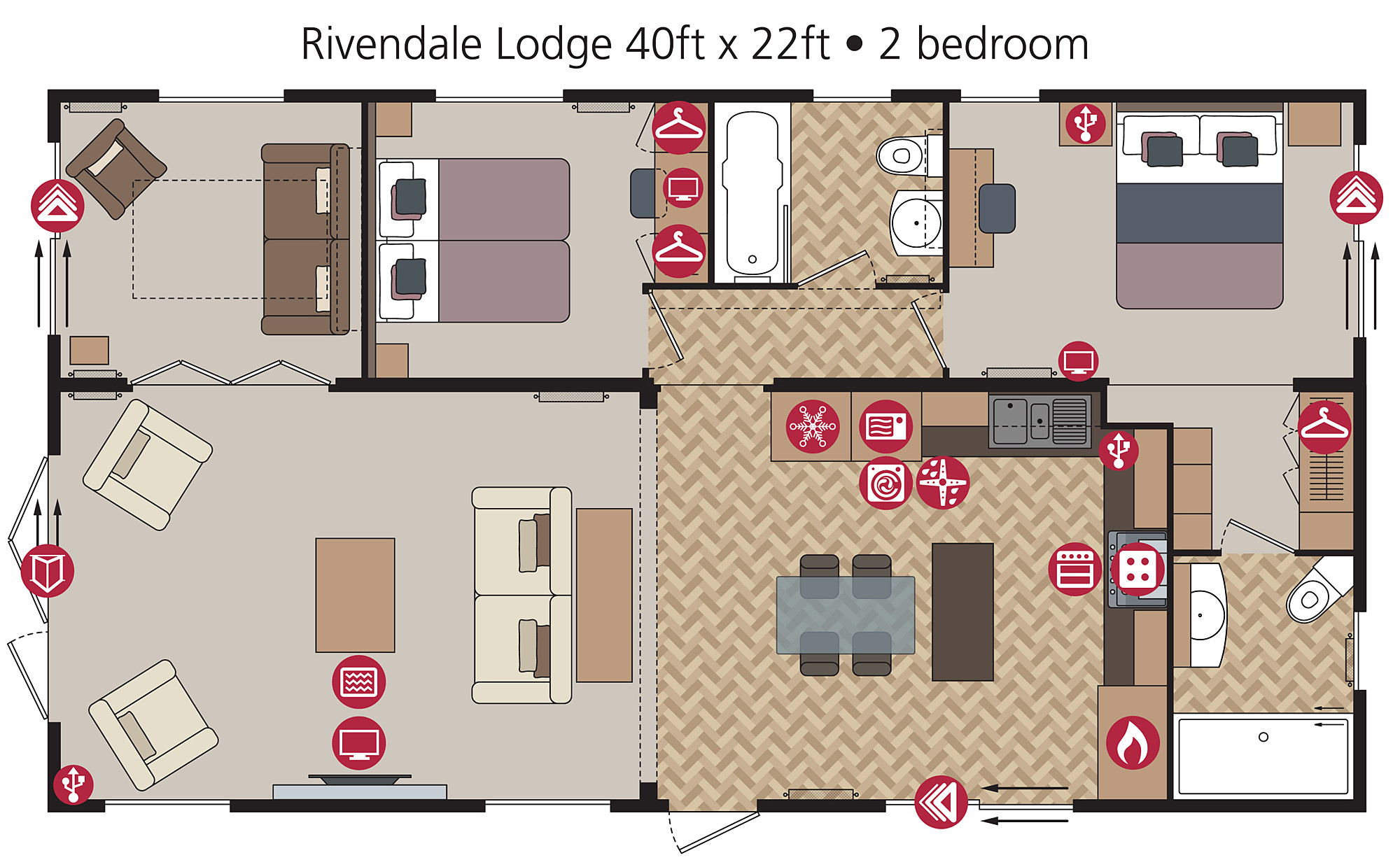 This brand new, modern-furnished Pemberton Rivendale (40'x20') luxury lodge is perfect for those looking for a detached, easy to maintain, bungalow-style property. The lodge has an open plan kitchen, dining and living area with large windows, two double bedrooms, an en suite and a bathroom.
